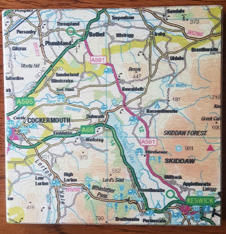 A lovely wooden set of 4 coasters with map of Lake District, when 4 coasters are put together it makes a larger map!
