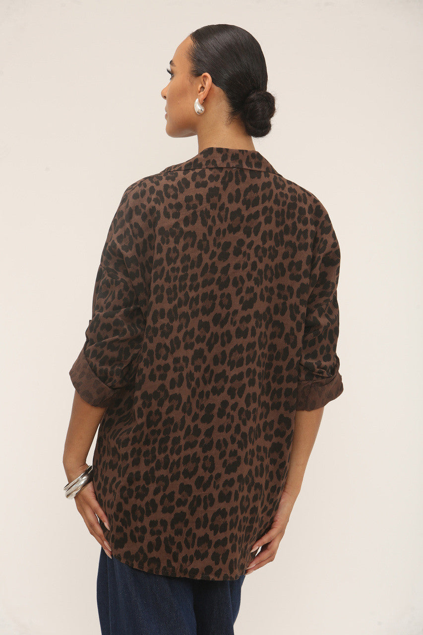 LEOPARD PRINT BUTTON-UP BLOUSE - BROWN