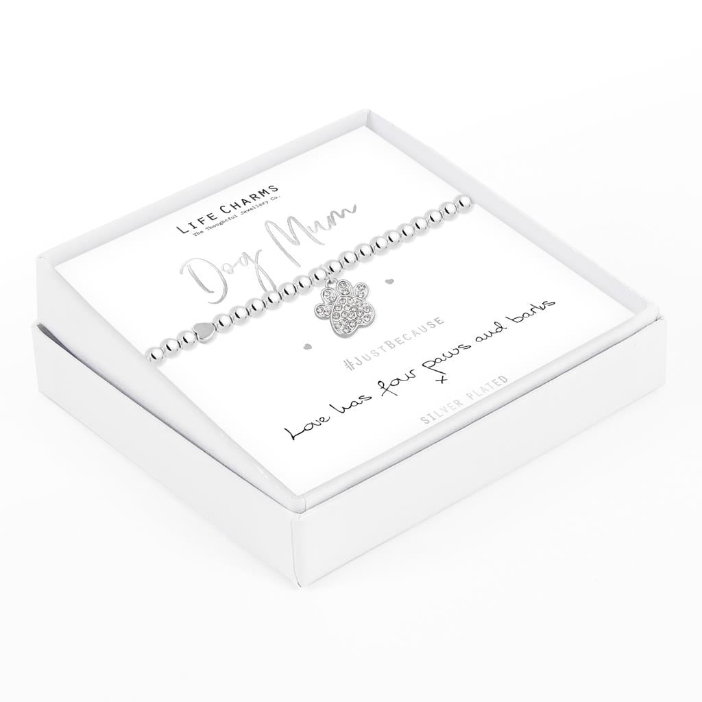 Pure silver plated dog's paw charm presented on a 5mm beaded stretch bracelet. The bracelet comes presented in a luxury gift box with silver foiled card. All jewellery is finished